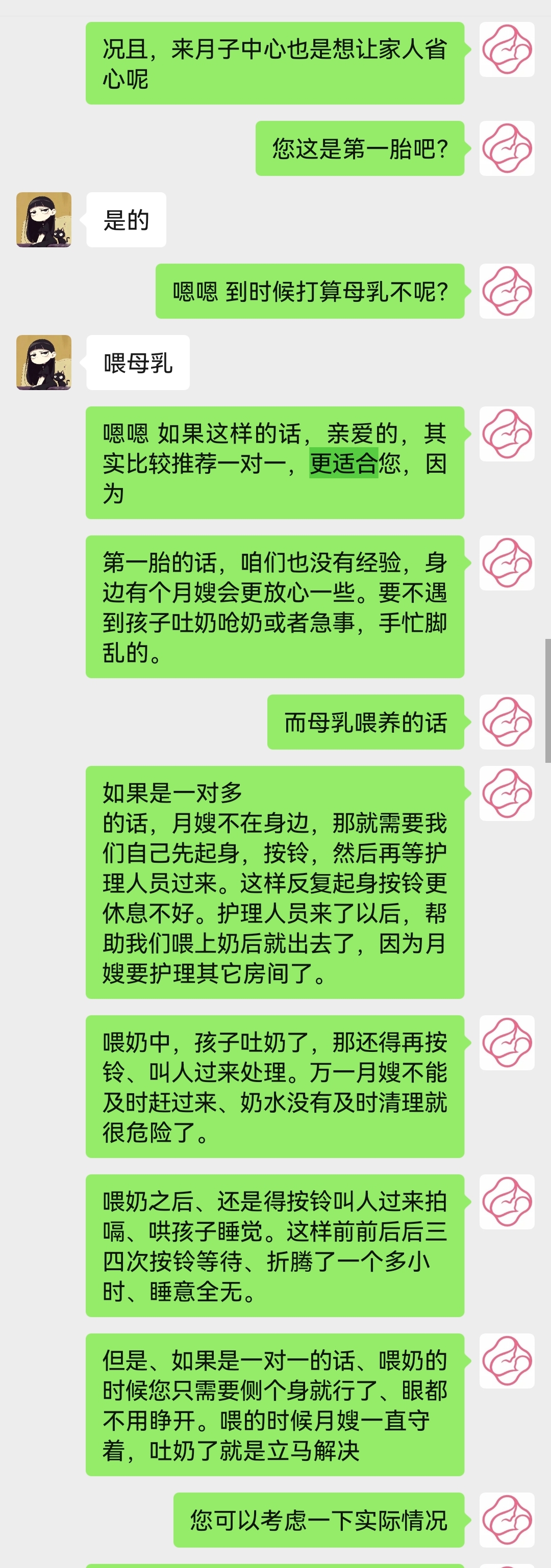 销售:咱们是第一胎,也没有经验,最好还是选择一对一模式。要是遇到宝宝吐奶、呛奶的,咱们束手无策的很危险,一对一月嫂在身边更放心,并且、月嫂老师还可以教一教我们如何带孩子。