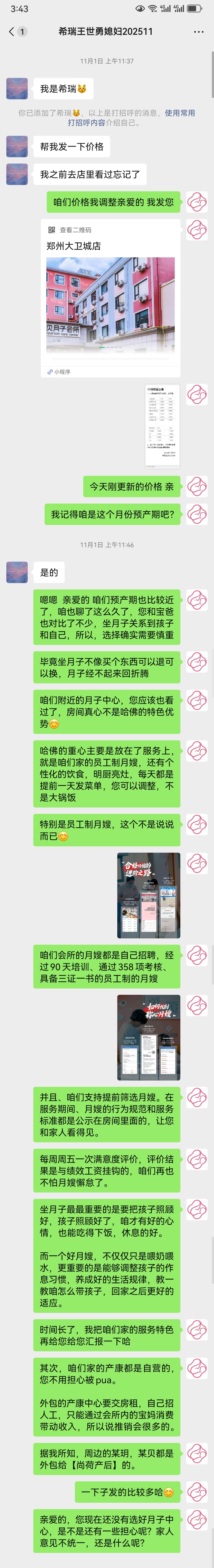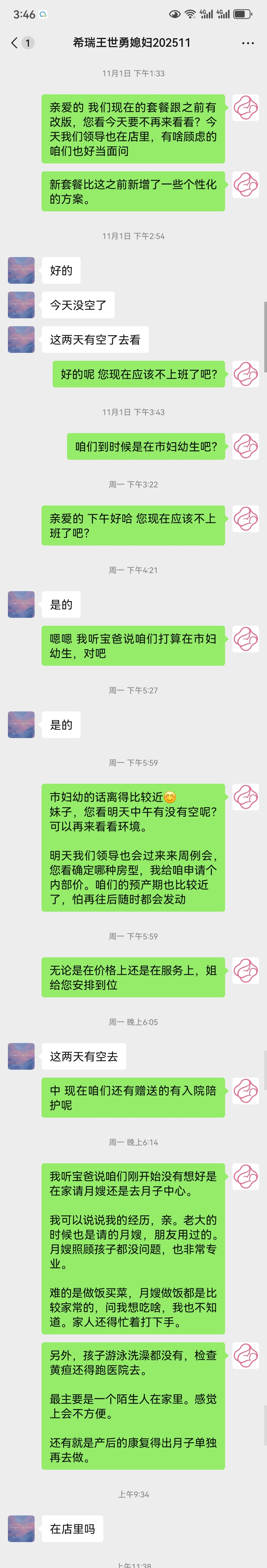 11月1日、宝妈突然加了我的微信,要再问一下价位。这说明现在还是在犹豫没有想好,并且预产期已经很近了。再次强调了一下会所的优势,扬长避短。