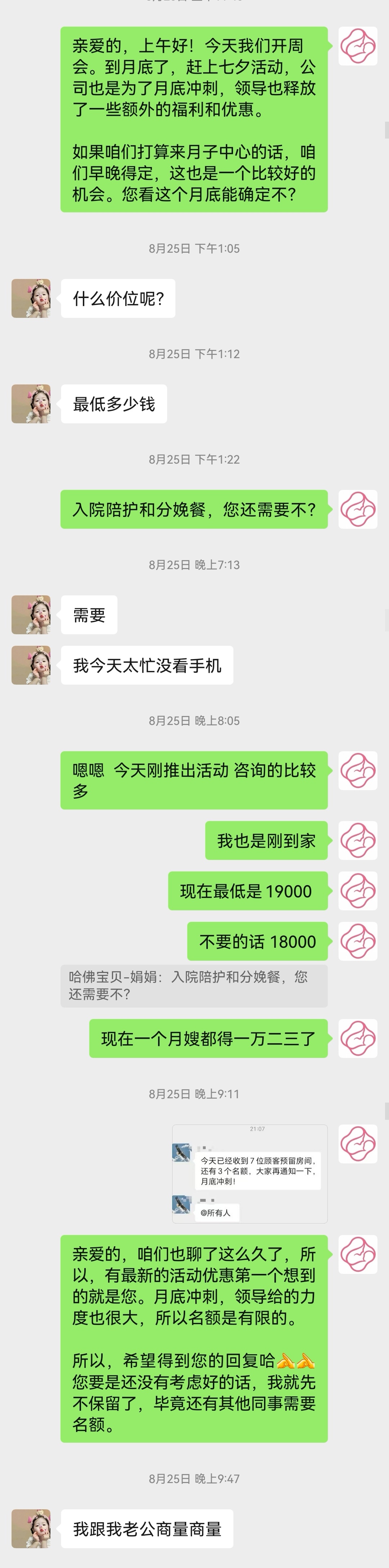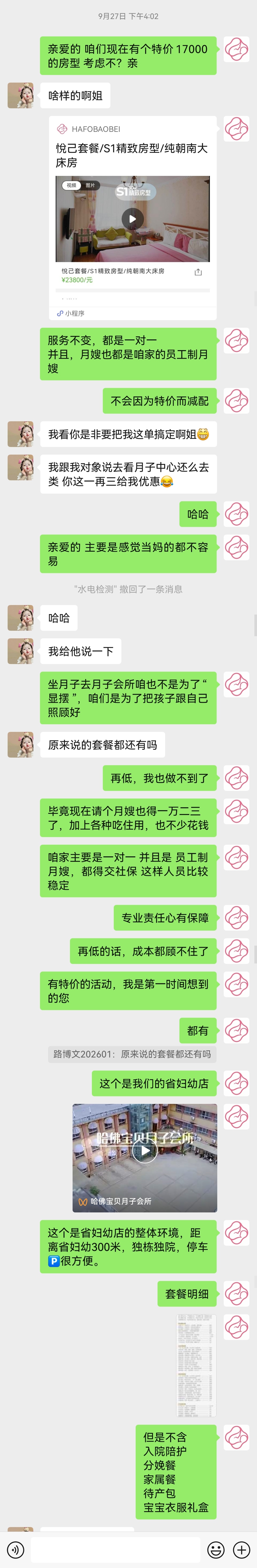 9月27号、再次发活动信息,利用特价房。顾客又想价格便宜、有想要全套服务...最后用升级房型不减价格的方式成交。并且、顾客最后好像入住后体验不错的话,打算升级到42天!