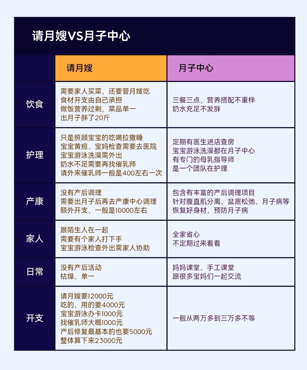 其实、您算一下在家请月嫂的开支、月嫂要一万二三,加上咱的吃住用、还有月嫂的吃住用,宝宝游泳洗澡、找催乳师、做产康,整体算下来比月子中心还多。