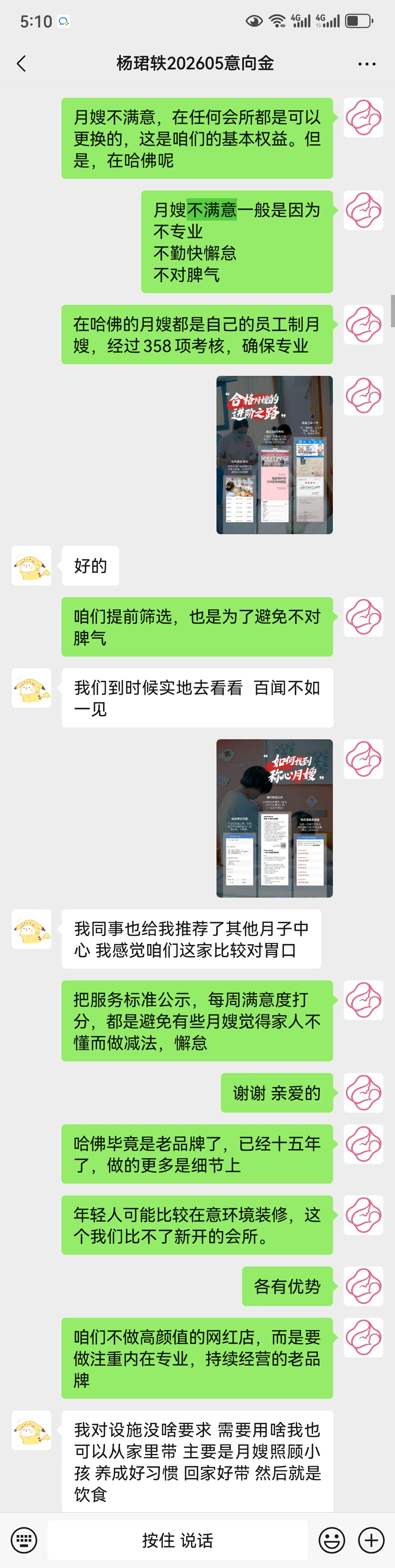 销售:亲、您的问题非常好。其实、无论咱们是选择哪一家月子中心月嫂不满意都是可以换的。就是想买东西包退包换一样,这是咱们的基本权益。但是、在哈佛宝贝我们想的是为什么月嫂不满意呢?往往是因为三个原因: